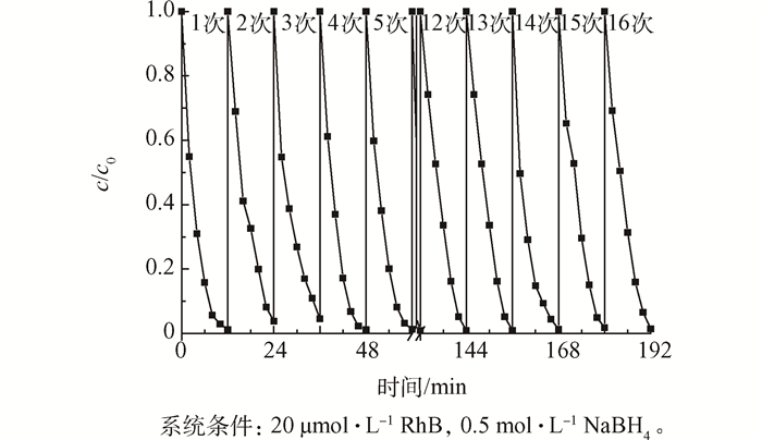 穩定性和循環性是衡量一種催化劑催化性能的重要指標。在本研究中,以羅丹明B為例,在每一次催化還原實驗后取出銅膜,用無水乙醇和超純水進行清洗,并用到下一次循環中,如圖 7所示,催化劑反復利用16次以后,羅丹明B的脫色效率仍然在98%以上,說明制備的銅膜結構穩定,可循環性好,實際應用價值高。