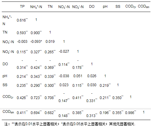 通過研究水質參數描述統計特征與各污染物指標相關性,可初步判斷北港河流域總體污染現狀.由表 2可知,北港河流域總體處于劣Ⅴ類,污染狀況較為嚴重,主要特征污染物為TN、NH4+-N、CODCr、TP,污染物濃度平均值分別為21.15、13.88、121.71、1.06 mg·L-1,分別達到了地表水Ⅴ類標準值的9.58、5.94、2.04、1.64倍(國家環境保護總局,2002);從變異系數看,pH最小,NO3--N最大,除pH外其他指標變異系數均較大,為38.13%~80.13%,這表明不同監測點位或不同時段污染物濃度值差異性大.