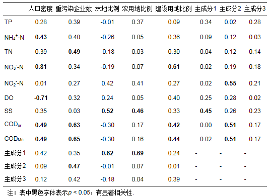 2) 污染物潛在影響因子相關性分析結果顯示,重污染企業數、人口密度、建設用地占比與流域氮、有機污染物具有顯著正相關性,表明重污染企業數、人口密度與建成區分布是影響水質的最主要指標.林地占比與大部分指標具有負相關性,主要是因為林地能減少徑流,進而減輕水土流失和由于水土流失造成的水質下降,即表明林地和草地是水體潛在的污染物的“匯”,有利于減小水體的污染.