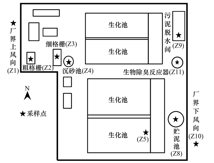 采樣點包括粗格柵(Z2)、細格柵(Z3)、曝氣沉砂池(Z4)、生化處理池(Z5)、貯泥池(Z8)和污泥脫水間(Z9)以及上、下風向廠界(Z1、Z10)(圖 1).所有采樣點設置在距離地面1.5 m處, 在生化池水面(Z6)及距離水面3 m(Z7)處也設置采樣點.生物除臭反應器的采樣點(Z11)設置在排氣口.