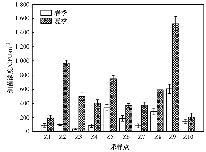 式中, c為空氣中微生物氣溶膠濃度(CFU ·m-3), N為細菌菌落數(CFU), V為采樣體積(m3).