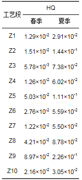 式中, EC為細菌氣溶膠的暴露濃度(CFU ·m-3), c為細菌氣溶膠逸散濃度(CFU ·m-3), ET為呼吸暴露的時間(8 h ·d-1), EF為呼吸暴露頻率(250 d ·a-1), ED為暴露年限(25 a), AT為預測的平均壽命(77 a). RfC為參考濃度, Kalogerakis等指出當細菌總數超過500 CFU ·m-3時將會對人體有害, 所以本研究中RfC取值為500 CFU ·m-3. HQ為非致癌風險因子, 當HQ < 1時, 細菌氣溶膠對人體的非致癌風險可以忽略, 當HQ>1時, 細菌氣溶膠對人體存在非致癌風險.由表 4可知, 人體通過呼吸途徑對各個工藝段逸散的微生物氣溶膠的暴露風險較低, 非致癌因子均小于1.與其他處理工藝段相比, 粗格柵、生化池以及污泥脫水間的暴露風險較高; 與春季相比, 夏季的暴露風險顯著增加.