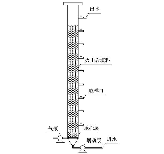 本試驗裝置采用有機玻璃制成的上向流生物濾柱反應器.如圖 1所示, 反應器內徑8 cm, 承托層裝填5 cm, 濾料裝填80 cm, 反應器有效容積為5 L.承托層采用粒徑為4~8 mm的礫石填料, 濾料采用直徑5~10 mm的黑色火山巖.濾柱由下向上每隔10 cm設置一個取樣口以便沿程取樣.反應器底部設曝氣裝置, 反應器外部纏繞黑色保溫棉以避光和保溫.