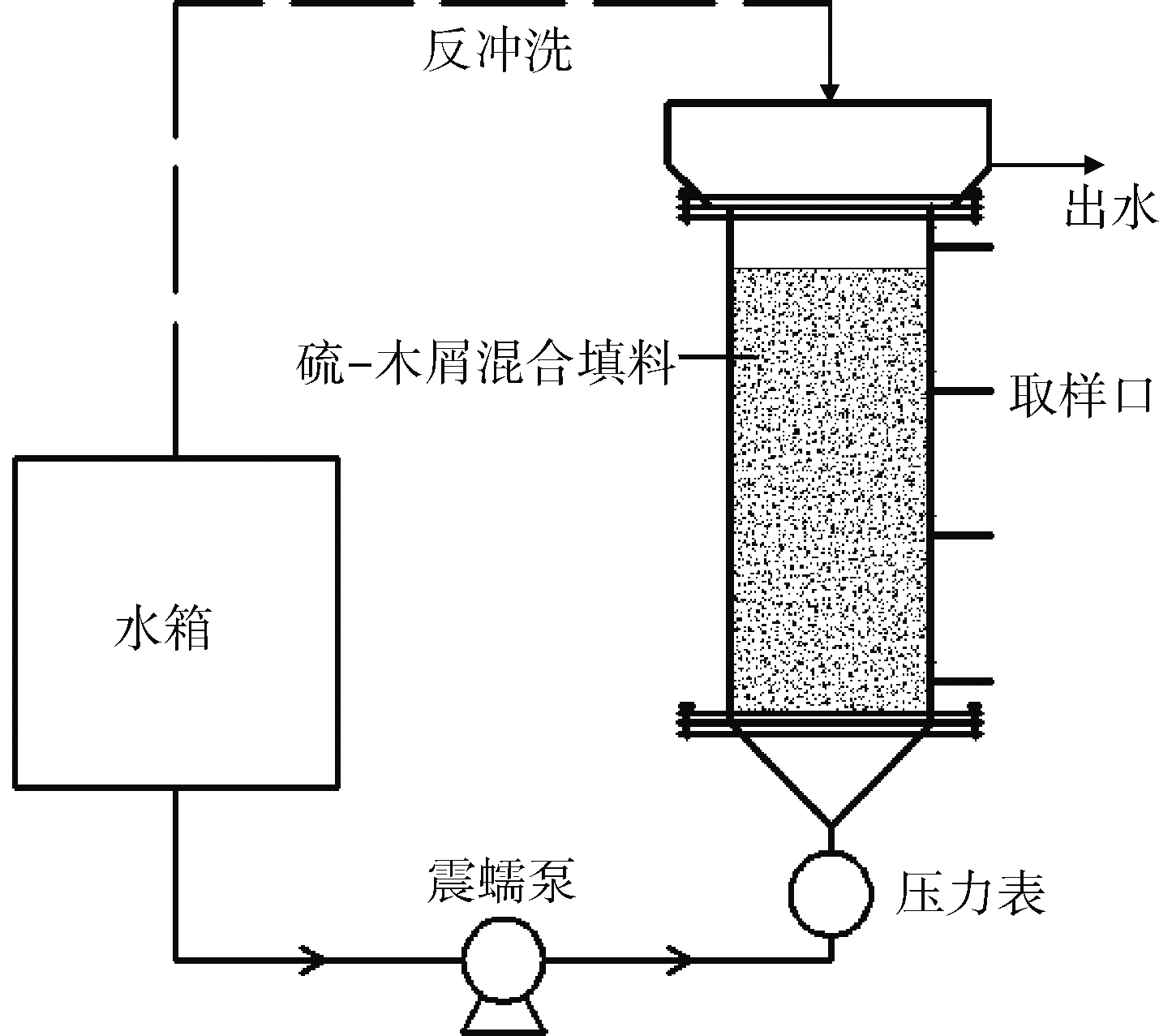 本實驗所采用的反應(yīng)器如圖1所示,其材質(zhì)為有機玻璃,反應(yīng)器內(nèi)徑160 mm,總高度370 mm,反應(yīng)區(qū)高250 mm,有效體積2.45 L,沿柱高均勻設(shè)置4 個取樣口,底部設(shè)置壓力表。木屑置于鼓風(fēng)干燥箱(DHG-9140A)中烘干24 h后取出,與硫磺顆粒(粒徑8~12 mm,中國石油化工有限公司)按1:1的質(zhì)量比混勻進(jìn)行填充。為防止啟動階段木屑隨出水流失,反應(yīng)器填充層底部和上部均填充3 cm厚的硫磺。