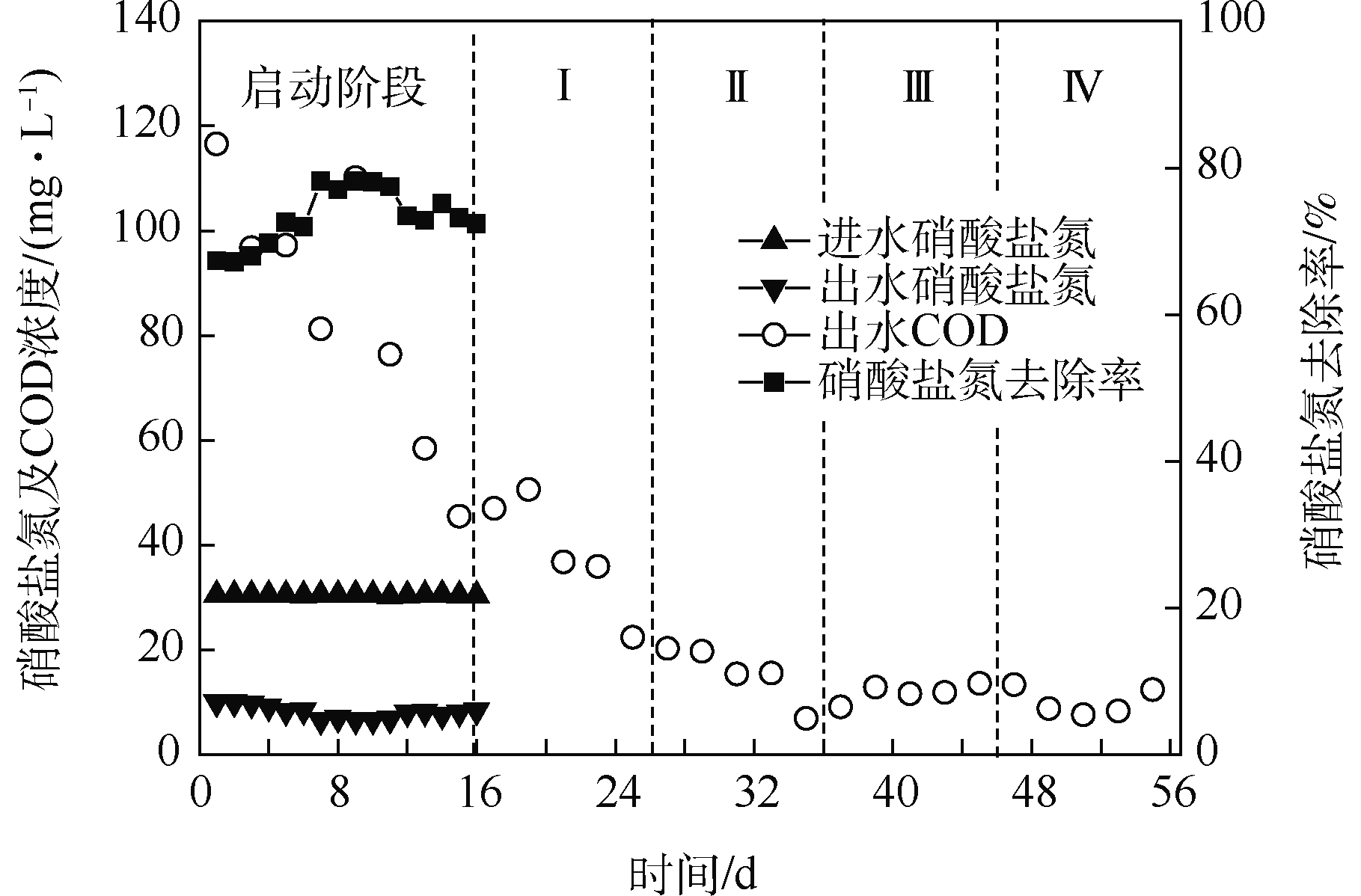由圖6可知,在反應(yīng)器啟動階段,木屑大量釋放碳源,硝酸鹽去除率較高,但出水中也含有諸如木質(zhì)素、纖維素等微生物暫時無法利用的碳源物質(zhì),使得出水COD濃度最高達(dá)到116.6 mg·L−1,而后出水COD濃度逐漸下降。第12 天至啟動階段結(jié)束,硝酸鹽去除率趨于穩(wěn)定,出水COD下降至45.5 mg·L−1。第16 天之后,出水COD繼續(xù)下降,至第24 天起,出水COD濃度再未超過30 mg·L−1。孫雅麗等以腐朽木為反硝化碳源進(jìn)行研究時發(fā)現(xiàn)反應(yīng)體系內(nèi)部已經(jīng)形成了一個水解菌與反硝化菌共存的微生物群落,在群落的作用下系統(tǒng)實現(xiàn)水解-反硝化脫氮目標(biāo)。這說明木屑在反硝化濾池中既是微生物生長富集的介質(zhì),也可以穩(wěn)定釋放碳源。運行條件的改變對碳源釋放的速率不產(chǎn)生影響,木屑釋放的碳源與異養(yǎng)反硝化過程消耗的碳源基本持平,出水中無過量殘留的碳源物質(zhì),木屑-硫磺異養(yǎng)自養(yǎng)聯(lián)合反硝化工藝不會對二級出水造成次生污染。
