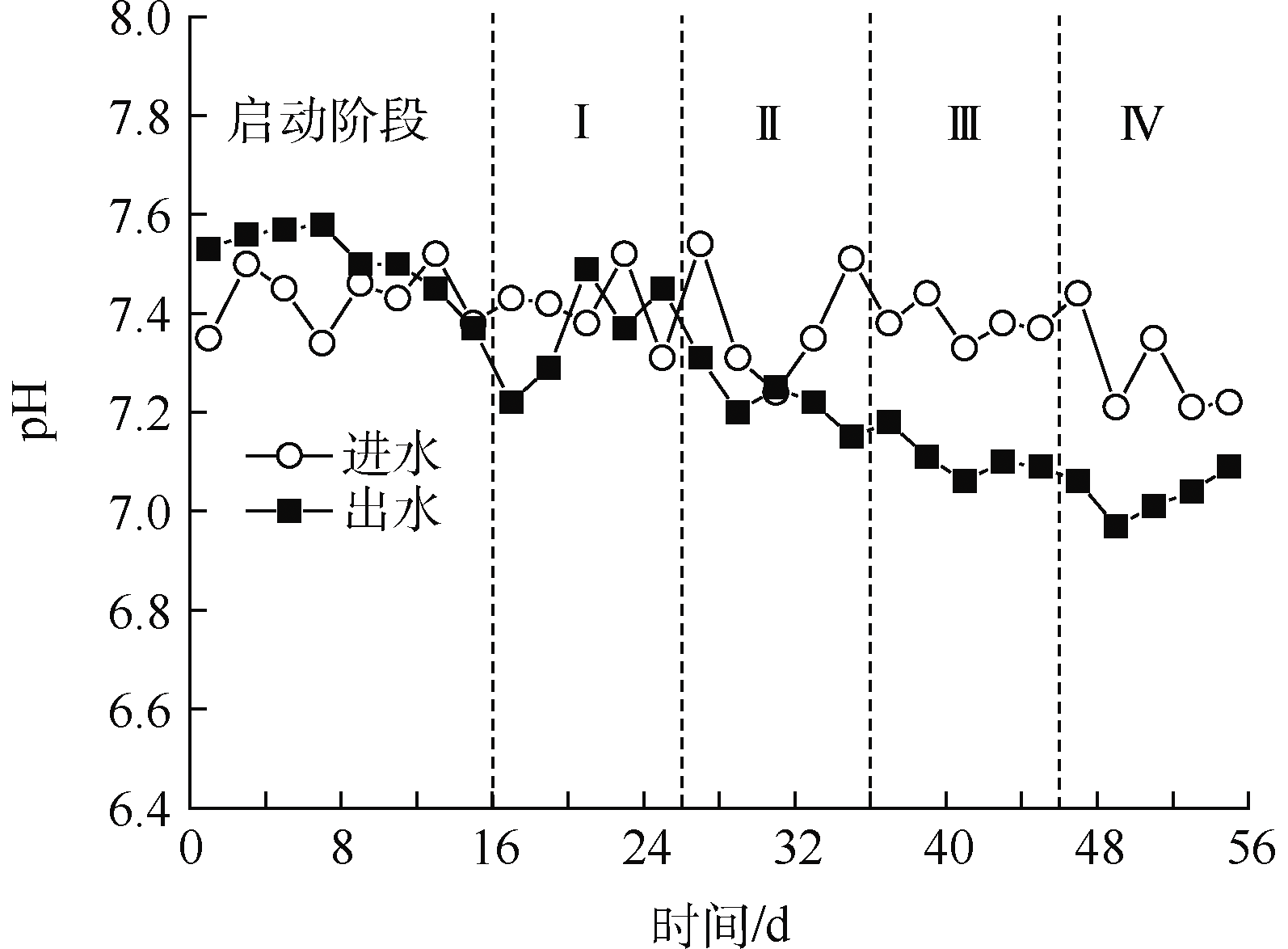 反應(yīng)器自啟動之后的pH變化如圖7所示。在反應(yīng)器運行的前16 d內(nèi),出水pH較高,最高為7.58。此時木屑釋放大量碳源,異養(yǎng)反硝化速率大于自養(yǎng)反硝化,反應(yīng)器內(nèi)部異養(yǎng)反硝化在異養(yǎng)自養(yǎng)聯(lián)合反硝化中所占的比重大于硫自養(yǎng)反硝化,產(chǎn)生的堿度大于消耗的堿度。第16 天之后,出水pH基本趨于穩(wěn)定,均在6.9~7.4的范圍內(nèi),出水呈中性。這是由于反應(yīng)器內(nèi)部以木屑為緩釋碳源的異養(yǎng)反硝化過程所產(chǎn)生的堿度與硫自養(yǎng)反硝化所消耗的堿度相當(dāng)。自第28 天開始,pH略有下降,最低降至6.97。說明此時硫自養(yǎng)反硝化所占比例加大,而這一階段硫酸鹽的生成量又呈現(xiàn)下降的態(tài)勢,可能是反應(yīng)器中硫酸鹽還原菌將部分硫酸鹽轉(zhuǎn)化成H2S的緣故。在運行56 d之內(nèi),反應(yīng)器出水pH未產(chǎn)生較大的波動,說明木屑-硫磺填充床反硝化生物濾池在運行過程中無需外加堿類物質(zhì)。