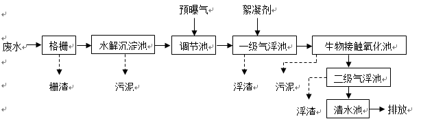 該污水處理工程采用了物化法和生化法相結合的處理工藝,絮凝氣浮能夠去除懸浮物和浮油,效果穩定;生物接觸氧化生物接觸氧化法是一種好氧生物膜法工藝,接觸氧化池內設有填料,部分微生物以生物膜的形式固著生長在填料表面,部分則是絮狀懸浮生長于水中,能夠充分分解廢水中的溶解性有機物。