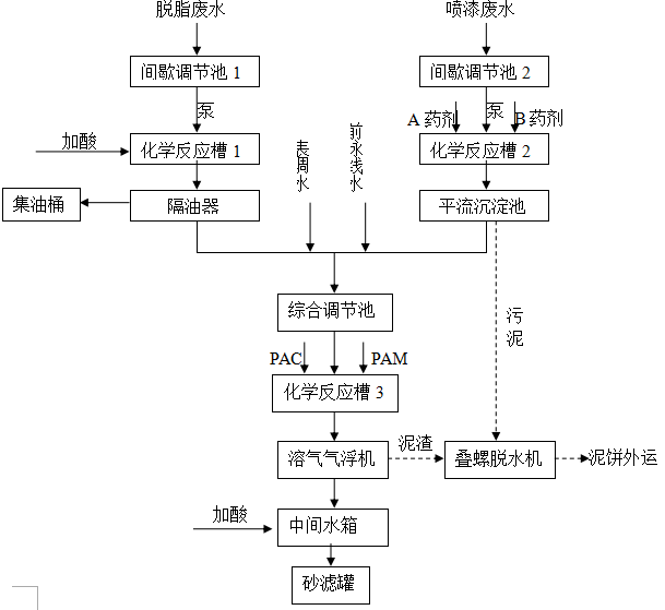 ②來(lái)自車間的噴漆廢水先進(jìn)入間歇調(diào)節(jié)池2進(jìn)行水質(zhì)水量調(diào)節(jié),經(jīng)泵提升至化學(xué)反應(yīng)槽2,分別加A藥劑和B藥劑,自流進(jìn)入平流沉淀池進(jìn)行混凝沉淀。