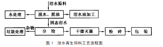 由于酒店泔水具有較全面的營養成分,有再生利用價值,對于集中收集衛生、新鮮的城市泔水,首先將其作脫水、脫油處理,然后對固態成分進行干燥滅菌,再通過機械加工,生產出固體飼料.簡單流程見圖: