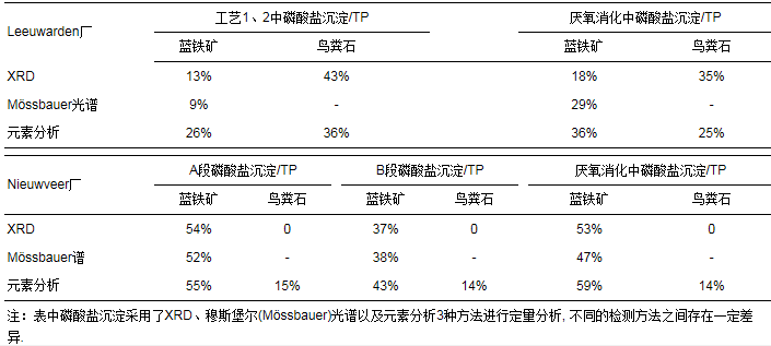表 1 荷蘭兩污水處理廠各階段污泥中藍(lán)鐵礦與其它磷酸鹽化合物含量