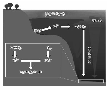 在自然水體底部沉積物中藍(lán)鐵礦形成存在兩個(gè)過程:①首先, 存在于有機(jī)物中的有機(jī)磷向無機(jī)磷酸鹽(PO43-)轉(zhuǎn)化及鐵的還原(Fe3+→Fe2+);②藍(lán)鐵礦生成并以晶體形式析出(Rothe et al., 2016).在富營養(yǎng)化水體表層, 磷往往存在于有機(jī)碎屑之中;因重力作用沉積于水體底部;沉于水底的有機(jī)磷會被厭氧微生物分解轉(zhuǎn)化為PO43-;同時(shí), 沉淀在水體底部的高價(jià)鐵化合物(Fe(Ⅲ))在異化金屬還原菌(DMRB)等微生物的作用下被還原為二價(jià)鐵離子(Fe2+);這兩個(gè)微生物過程持續(xù)進(jìn)行則會在水體底部形成一個(gè)Fe2+、PO43-局部濃度較高的環(huán)境條件而產(chǎn)生化學(xué)反應(yīng), 反應(yīng)產(chǎn)物(藍(lán)鐵礦)達(dá)到飽和時(shí)便會以晶體形式析出, 從而將磷元素固定在水底沉積物中.藍(lán)鐵礦在自然水體中的形成過程可用圖 2(Reed et al., 2016)及公式(1)~(4)來描述(Stabnikov et al., 2004).