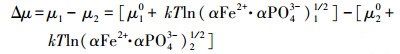 此外, 藍(lán)鐵礦還是一種晶體, 在水溶液中析出還與晶體生長有關(guān).晶體生長一般可以分為晶核生成和晶體生長, 當(dāng)離子復(fù)合形成晶胚后晶體開始成長, 直至達(dá)到沉淀平衡狀態(tài).在藍(lán)鐵礦生成的溶液體系中溶液達(dá)到平衡狀態(tài)時(shí)的化學(xué)勢μ1和溶液過飽和時(shí)的化學(xué)勢μ2之差Δμ是在溶液體系內(nèi)生成藍(lán)鐵礦沉淀的反應(yīng)動力, 如式(5)所示(閔乃本, 1982).