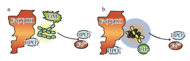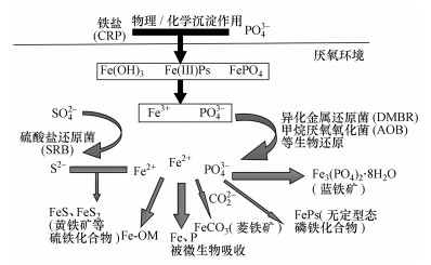 天然水體中的鐵可能來源于鐵礦石溶解或是其它人為添加, 飲用水或污水往往因膠體混凝或化學(xué)除磷常常需要投加大量鐵混凝劑.然而, 水環(huán)境中的這些鐵主要以高價(jià)(Fe3+)形式存在.水中Fe3+主要以水解形成絮狀羥基鐵(Fe(OH)3, HFO)為主, 因其具有較大比表面積而表現(xiàn)出較強(qiáng)的吸附性能, 可吸附PO43+而形成沉淀.此外, 未水解的Fe3+還會與水中PO43-直接生成FePO4沉淀.以上由Fe3+誘導(dǎo)生成的含磷沉淀物Fe(Ⅲ)-P會在厭氧以及在有機(jī)物存在條件下被異養(yǎng)金屬還原菌(DMRB)、甲烷厭氧氧化細(xì)菌(AOM)等微生物還原(O′Loughlin et al., 2013), 如式(2)和(7)(Fu et al., 2016)所示;該還原過程會使Fe(Ⅲ)-P沉淀再次溶解釋放PO43-和Fe2+, 如圖 3所示.