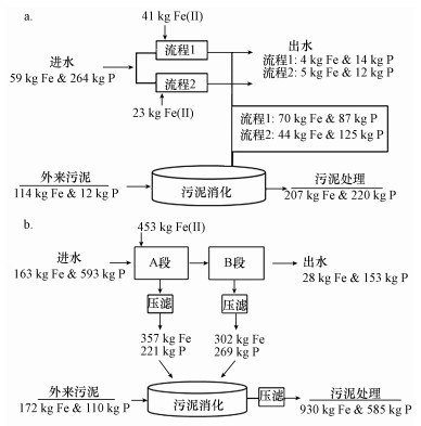 圖 6荷蘭調(diào)研污水處理廠中磷、鐵流動平衡:Leeuwarden廠(a);Nieuwveer廠(b)(Wilfert et al., 2016)