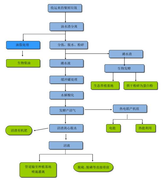 預處理-水解酸化-產沼氣-沼氣利用-沼液,沼渣處理及再利用