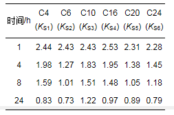 結合圖 7a和公式(13)可知, 因為距離長傳遞的時間越長, 有更多的時間來傳遞, 因此可以從傳遞距離得出:KS*(C4)> KS*(C6)> KS*(C10)> KS*(C16)> KS*(C20)> KS*(C24).由于傳質系數越大, 傳質阻力將越小.研究可以得出高COD會使得生物膜DO傳質阻力更大.但這有助于DO在生物膜好氧、缺氧和厭氧層的形成.結合生物膜在圖 5所示的形態, 更高的生物膜的孔密度具有更高的傳遞阻力.
