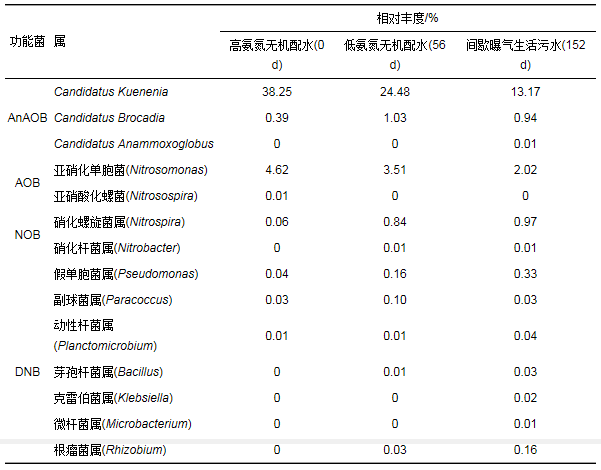 高氨氮無機配水階段(0 d)、低氨氮無機配水階段(56 d)、間歇曝氣生活污水階段(152 d)的脫氮功能菌屬水平的相對豐度如表 4所示.