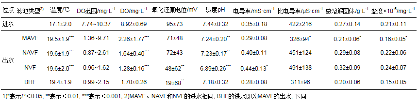 由表 2可知, 4種不同工況生物濾池進出水理化參數間的差異主要體現在溫度、溶解氧、氧化還原電位、堿度等指標上, 而電導率、比電導率、總溶解固體、鹽度等指標的變化較小.另外, 與3組垂直流濾池相比, 水平流濾池進出水間的差異更小(僅氧化還原電位存在顯著差異).進一步比較發現, 經垂直流濾池處理后, 出水溫度顯著升高, 溶解氧、pH顯著降低.溫度升高可能是因為曝氣所致(鼓風機持續運行發熱, 吹出的空氣高于室溫); 溶解氧、pH降低是因為濾池內部存在硝化過程, 需要消耗溶解氧和堿度.曝氣顯著提高了濾池出水溶解氧和pH(NVF出水的DO、pH分別與NAVF、MAVF出水的DO、pH相比, 所有P<0.05), 原因可能是因為硝化過程需要消耗CO2, 曝氣能不斷地向濾池內部輸送O2和CO2, 而未曝氣濾池硝化過程需要消耗原水中的CO32-或HCO3-, 后者致使pH降低.此外, 依據高立杰等提出的DO等級劃分方法, 即<0.3mg·L-1代表厭氧、0.4~0.7 mg·L-1代表兼氧及>1.0mg·L-1代表好氧, 本研究4組濾池內溶解氧含量處于好氧和兼氧水平.