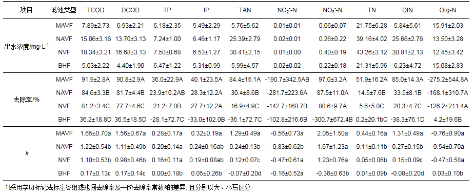 表 3 4種不同工況濾池的進出水濃度、去除率及一階去除率常數比較1)