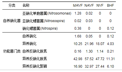 進一步分析自養硝化菌相對豐度數值, 發現NVF濾池缺乏自養硝化及亞硝化菌, BHF濾池內缺乏自養亞硝化菌, 而NAVF中缺乏自養硝化菌, 只有MAVF濾池同時含有硝化及亞硝化菌, 且MAVF濾池自養硝化菌(硝化+亞硝化菌)豐度明顯高于其它3組濾池.這與2.2節觀測到的MAVF濾池氨氧化作用最強, BHF濾池氨氧化作用最弱相一致. NVF及BHF濾池內的氨氧化過程均由異養菌完成, 且NVF濾池的氨氧化能力強于BHF濾池, 這是因為前者的異養硝化菌豐度明顯高于后者(表 5).此外, 與兩組曝氣濾池(MAVF和NAVF)相比, 其余兩組未曝氣濾池(NVF和BHF)內均未檢測到亞硝化菌, 說明曝氣促進了濾池內氨氧化菌的富集.將表 5中各功能菌相對豐度與碳、氮、磷去除的k值進行相關性分析, 發現僅自養硝化菌(硝化+亞硝化菌)與氨氮、總氮及溶解性氮素之間存在顯著正相關(P<0.05), Pearson相關系數分別為0.97、0.97和0.96, 這可能也暗示影響各種濾池脫氮的主要過程仍然為硝化過程, 且主要依賴于自養硝化菌.