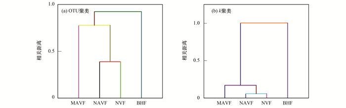 采用獨立t-test檢驗各組濾池進出水間理化特征的差異.因為BHF濾池進水即為MAVF出水, 為了屏蔽進水濃度對濾池凈化效率的影響, 以進水污染負荷為協變量, 采用協方差分析比較各組濾池間凈化效率的差異.此外, 為了比較各組濾池微生物群落結構及凈化效率的相似性, 采用層次聚類法對優勢菌種的相對豐度、所有OTU序列數及一階去除率常數k進行聚類; 同時為了探究優勢菌種與濾池出水理化環境特征及凈化效率的關系, 還對這些變量進行了冗余度(redundancy analysis, RDA)排序分析.選擇RDA是因為某些污染物指標的k值為負.排序、聚類分析分別在CANOCO 4.5、ORIGIN8.6軟件中完成, 其它分析在SPSS 19.0軟件中完成.