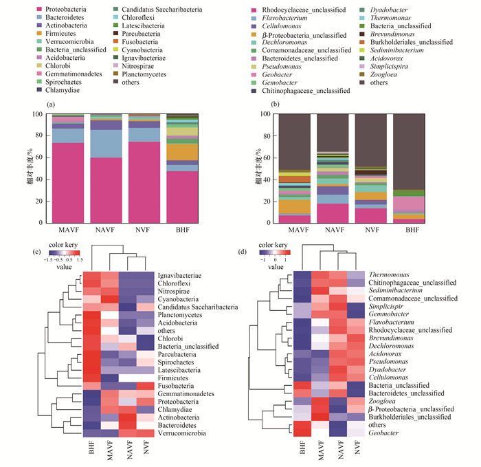 依據測序獲得的特征序列進行物種注釋, 4組濾池共注釋到341屬種微生物, 其中MAVF、NAVF、NVF、BHF的物種數分別為212、200、161、257, 這與前面描述的多樣性指數變化趨勢一致.此外, 將所有物種的相對豐度均列出并不便于分析, 而且優勢物種往往就能反映群落結構的主要特征.因此, 本文選取豐度最高的前20個物種或功能分類, 將其余的設置為others, 進行相對豐度計算, 并據此繪制相對豐度堆疊柱狀圖[圖 3(a)和3(b)]和物種分類熱圖[圖 3(c)和(d)], 便于直觀進行樣品間物種豐度的比較.