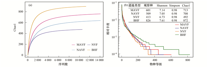 4種不同工況濾池在試驗末期取陶粒樣品進行微生物群落結構檢測, 通過16S rDNA高通量測序分析共獲得96 708條有效序列, 它們在4組濾池內的分布是:MAVF(16676)、NAVF(57367)、NVF(11161)和BHF(11504).這些有效序列經聚類后共獲得2 260個OTU, 它們在4組濾池內的分布是:MAVF(680)、NAVF(691)、NVF(413)和BHF(828).再依據4組濾池所含OTU序列數繪制等級豐度圖和相應的α多樣性指數.由樣品測序稀釋曲線圖 2(a)可知, Chao1曲線趨于平緩, 表明測序數據量已飽和; 由圖 2(b)可知, 4組濾池的辛普森指數(Simpson)一致(均為0.98), 而觀察種(Observed species)、香農(Shannon)、Chao1等指數存在明顯差別, 順序都是BHF>MAVF>NAVF>NVF, 表明濾池的成熟度與微生物多樣性密切相關, 即濾池愈成熟, 多樣性指數愈高.