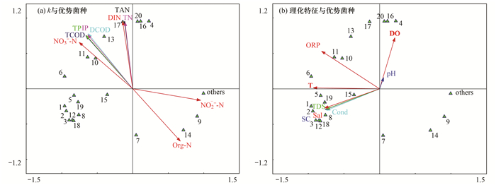 如2.3節所述, 將獲得的2260個OTU按各自所含的序列數進行樣品聚類, 結果如圖 4(a)所示; 同樣地, 按測定的各項污染物指標k值進行樣品聚類, 結果如圖 4(b)所示.由圖 4可知, 兩種不同途徑聚類結果與豐度最高的前20個優勢物種熱圖聚類[圖 3(c)和3(d)]具有一致性, 即豐度最高的前20個優勢物種基本能涵蓋所有物種的聚類信息.另外, 各組濾池凈化效率聚類結果與物種聚類結果一致, 這也表明濾池之間凈化效率的差異主要由濾池內微生物結構差異所致.為了進一步探討濾池凈化效率與微生物群落組成的關系, 將濾池的凈化效率與圖 3中優勢物種組成以及后者與濾池出水理化特征進行多元排序分析, 結果如圖 5所示.