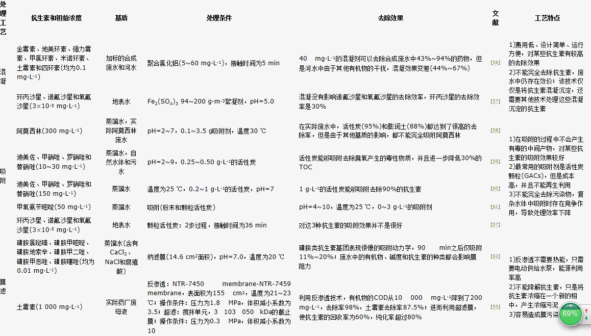 目前,常用的抗生素的物化處理技術有混凝、吸附、膜濾、氧化技術(氯化、芬頓、臭氧、光催化和電化學氧化等)等。表 2總結了這些技術和工藝對抗生素的去除效果和特點。總的來說,混凝、吸附和膜濾屬于物理處理技術,對部分抗生素有良好的處理效果,并且不會產生有毒的中間產物,但是僅僅是將抗生素轉移到另一個相中,沒有在真正意義上去除抗生素;氧化技術屬于化學處理技術,雖然對很多抗生素有很好的處理效果,但是沒有選擇性,耗能和成本也相對較高,強化催化水解技術利用了大多數抗生素容易水解的特性,能夠選擇性地去除大部分種類的抗生素。