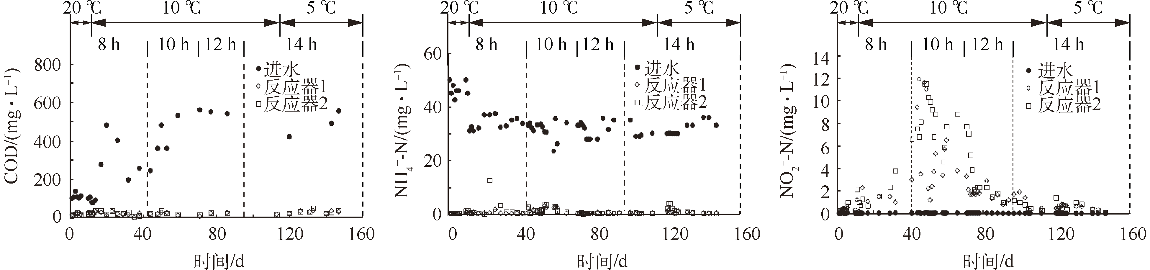 進水NH4+-N濃度范圍為30~40 mg·L−1。當水溫降至10 ℃時,出水中的NH4+-N濃度開始出現上升,且NO2−-N發生積累(圖2)。運行至第45天時,HRT從8 h調整至10 h,并在第96天增加為14 h,期間出水中的NH4+-N與NO2−-N積累現象均消失。水溫降至5 ℃時,2個反應器出水中的NH4+-N與NO2−-N濃度均未再出現明顯升高。