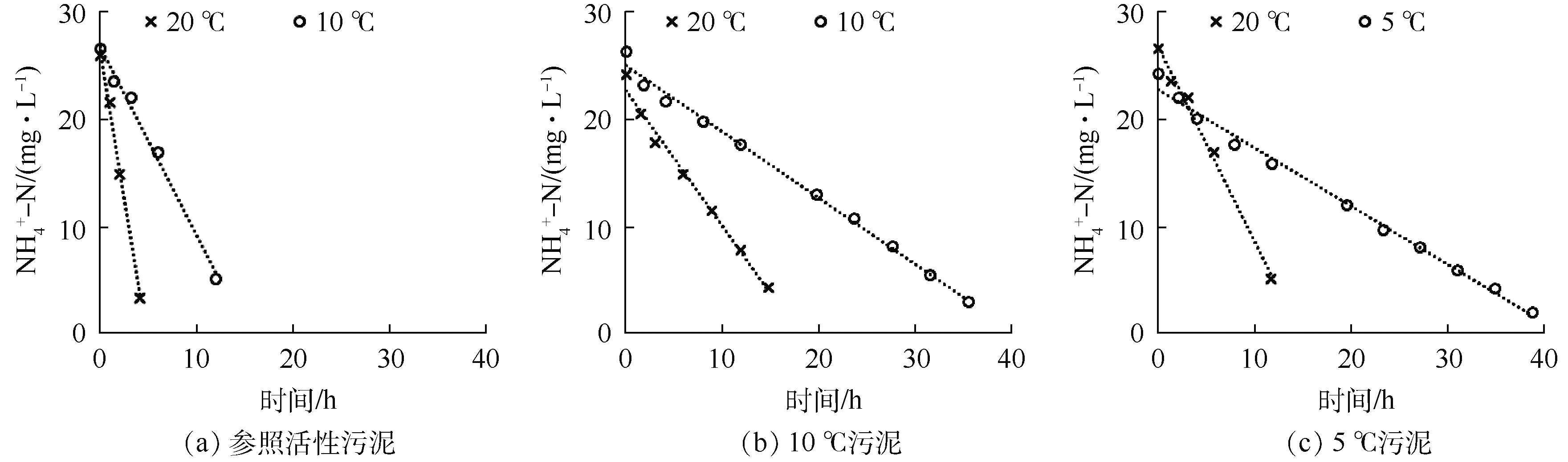 從平行反應器中各取2個生物填料加入到500 mL人工配水中,在20、10和5 ℃條件下進行曝氣,按一定時間間隔取水樣測定NH4+-N、NO2−-N和NO3−-N。配水主要成分為NH4Cl (NH4+-N濃度28 mg·L−1),微量元素儲備液1 mL·L−1。同時,取某城市污水處理廠活性污泥(水溫為14 ℃),在MLSS稀釋為4 205 mg·L−1、NH4+-N含量為28 mg·L−1的條件下分別測定了20 ℃和10 ℃活性污泥的硝化速度。每次測定平行2次。