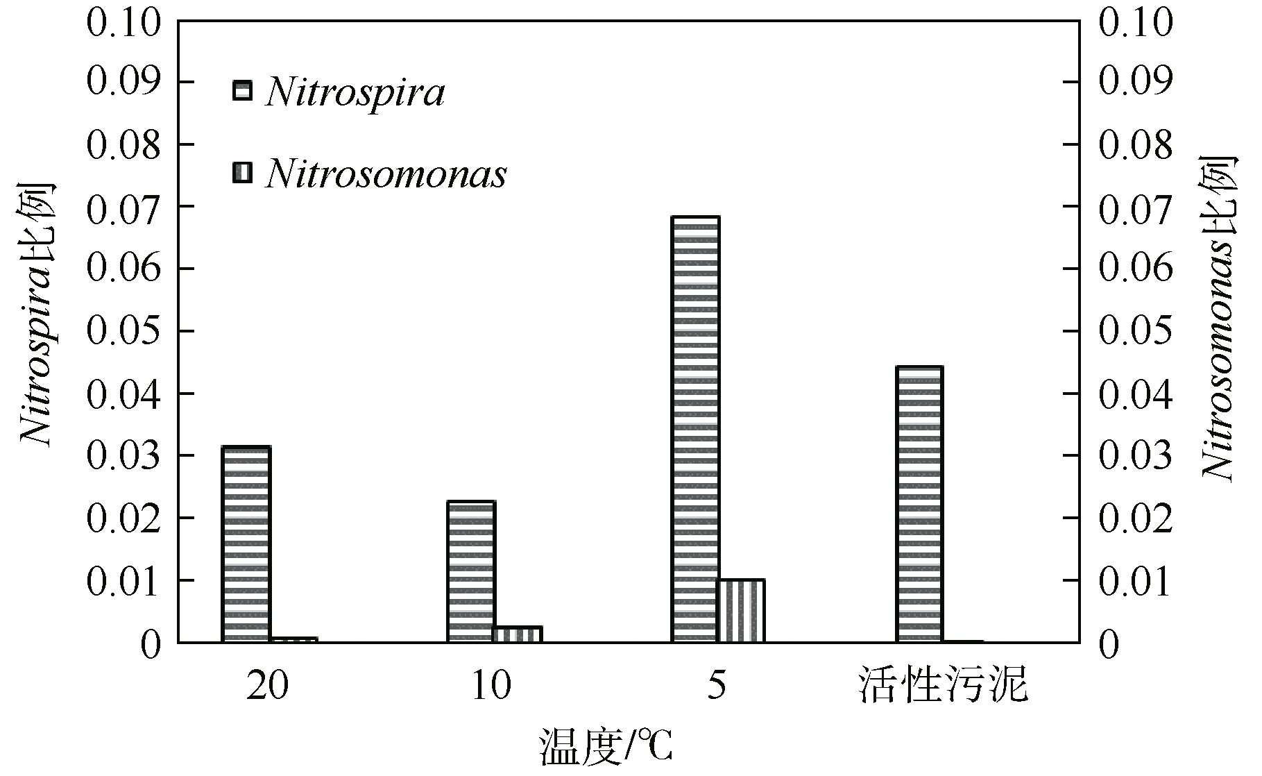 高通量測序結果表明,生物接觸氧化反應器中最主要的氨氧化細菌和亞硝酸鹽氧化細菌分別為亞硝化單胞菌屬(Nitrosomonas)和硝化螺旋菌屬(Nitrospira)。圖5顯示當水溫保持在5 ℃連續運行時,生物接觸氧化污泥中硝化螺旋菌屬和亞硝化單胞菌的豐度反而呈現出上升趨勢,這可能是5 ℃生物接觸氧化污泥比硝化速率與10 ℃污泥基本一致的重要原因。前期關于膜生物反應器的研究也發現,硝化螺旋菌屬在降溫過程中(19.7~8.7 ℃)其豐度可以從8.9%增加至最多的15.1% 。然而低溫條件下硝化菌群的富集原因仍然有待于進一步深入研究。