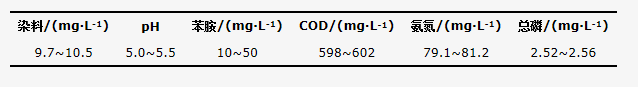 紡織廠工業(yè)廢水中的染料濃度范圍一般在10~200 mg·L-1,根據(jù)廈門市某紡織廠的生產(chǎn)廢水配制不同苯胺濃度的RBK5染料廢水,進(jìn)水水質(zhì)見表 1。牡蠣殼陶粒生物濾柱中的未馴化污泥取自華僑大學(xué)中水處理站的曝氣池,活性污泥過篩后裝入連續(xù)曝氣的MSB-BAF和MB-BAF反應(yīng)器,加入生活污水進(jìn)行污泥馴化,控制進(jìn)水流速為170 mL·h-1。待反應(yīng)器內(nèi)的污泥馴化完成,出水水質(zhì)穩(wěn)定,加入一定量含苯胺的RBK5染料廢水開始運行過程。通過逐漸提高M(jìn)SB-BAF和MB-BAF反應(yīng)系統(tǒng)的苯胺濃度進(jìn)行活性污泥馴化。在運行過程中,每天取反應(yīng)器的進(jìn)水、出水,分析其中染料、苯胺、COD、氨氮、總磷濃度以及pH值的變化。每個苯胺濃度梯度下,運行1~3周后,系統(tǒng)出水水質(zhì)基本穩(wěn)定,進(jìn)入穩(wěn)定狀態(tài)繼續(xù)運行1周。