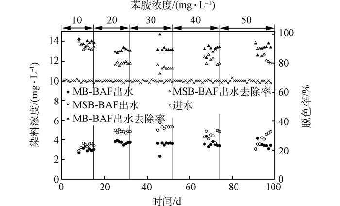 進(jìn)水RBK5的濃度為10 mg·L-1,染料的脫色效果如圖 4所示,MSB-BAF和MB-BAF對染料的脫色率隨苯胺濃度的上升變化不大,平均脫色率分別為90.7%和83.2%,MB-BAF對染料的脫色效果要略微優(yōu)于MSB-BAF。其原因是經(jīng)過一段時間的馴化,生物濾柱填料表面形成了一定數(shù)量的RBK5脫色菌群,由于陶粒表面積更大,更加有利于負(fù)載微生物,因此大部分微生物都負(fù)載在陶粒表面,MB-BAF由于混合均勻更有利于脫色菌的固定化,而MSB-BAF由于分層后,脫色菌集中在陶粒層,因此引起停留時間略微縮短,導(dǎo)致MSB-BAF對RBK5的脫色率略低。