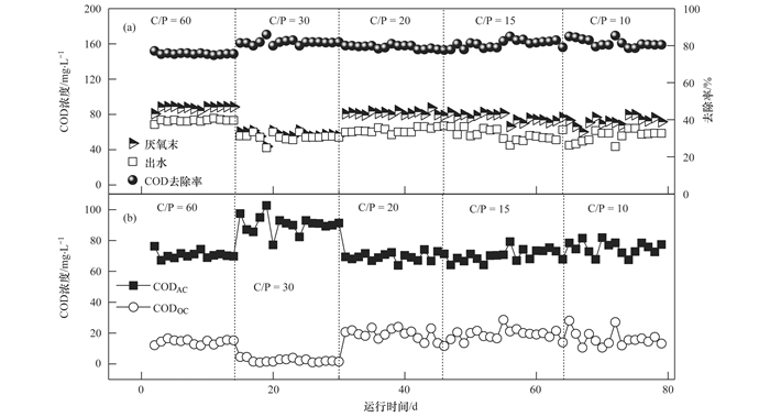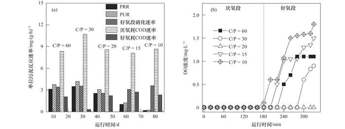 同時當系統進水C/P由60降低至30時, 系統厭氧段COD去除速率由8.3 mg·(g·h)-1提高至10.7 mg·(g·h)-1, 好氧段COD去除速率由2.1 mg·(g·h)-1降低至0.3 mg·(g·h)-1.而隨著C/P由30持續降至10, 系統厭氧段COD去除速率降低至8.5 mg·(g·h)-1并維持, 好氧段COD去除速率逐漸提高并維持在2.3 mg·(g·h)-1.該結果與2.2節的解釋相一致.