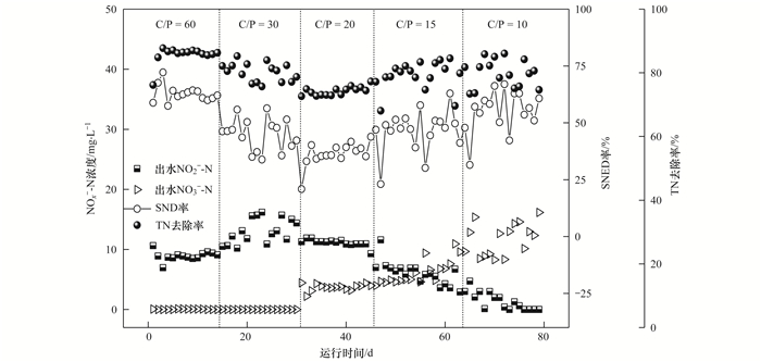 當C/P為15時, 出水NO3--N濃度由3.9mg·L-1提高至10.9mg·L-1, 而出水NO2--N濃度由11.6mg·L-1降至3.1mg·L-1, TN去除率由77.1%升高至84.6%, SNED率由43.8%提高至53.6%.此時, 出水NOx--N主要以NO3--N為主, 出水NO2--N開始逐步降低.分析其原因可能在于隨著系統除磷性能降低, 使好氧段硝化菌可利用的DO增多, 促進NO2--N向NO3--N的進一步轉化.當進水C/P為10時, 系統出水NO2--N由2.9 mg·L-1逐步降低為0mg·L-1, 而出水NO3--N由9.3 mg·L-1升高至14.3 mg·L-1, TN去除率和SNED率分別平均為79.8%和56.4%.