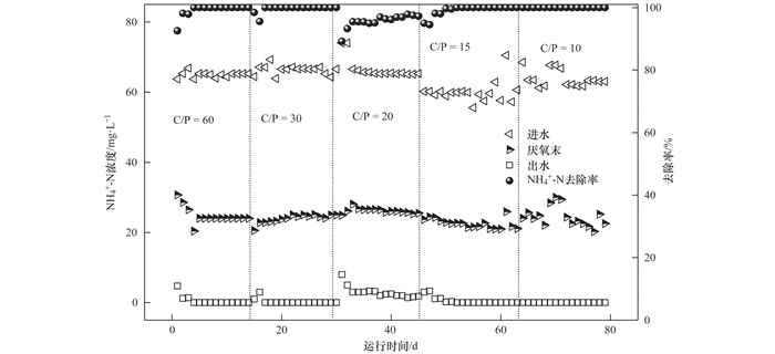 從圖 3可以看出, 當進水C/P為60和30時, 系統具有較高的硝化性能, 表現為NH4+-N去除率為100%.由2.1節可知, 在C/P為30時, PRA最高, 而此時好氧段末期NH4+-N為0mg·L-1.說明系統好氧段PO43--P的去除主要是通過缺氧(內源)反硝化實現的.