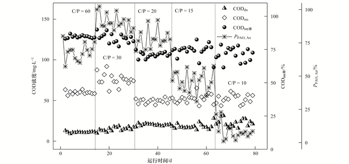 當C/P為20時, CODdn由13.9 mg·L-1升高至22.1 mg·L-1, CODins率和PPAO, An分別由81.1%和89.6%降低至67.4%和62.1%.說明C/P的降低使系統厭氧段由異養菌去除的COD開始增多, 且PAOs對COD的利用能力減弱.該C/P條件下系統厭氧段內碳源的儲存由PAOs和GAOs共同來完成, 但PAOs較GAOs在厭氧段內碳源的利用仍占優勢.