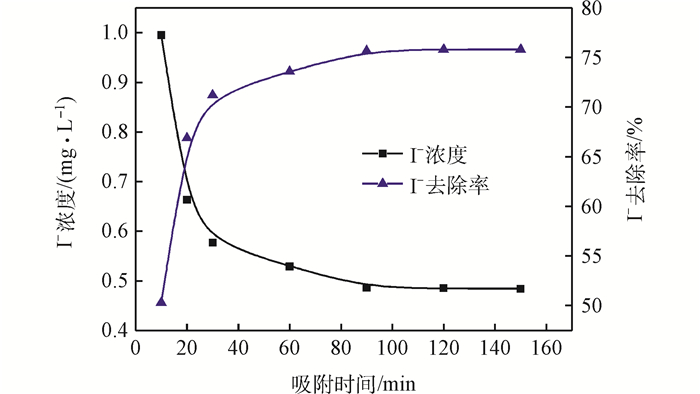 當吸附劑投加量為1.00 g·L-1時,動力學實驗結果如圖 2所示。在最初的30 min內, I-濃度迅速下降,在30~90 min之間I-濃度緩慢下降,90 min之后I-濃度基本不變,去除效率逐漸趨于恒定,故吸附平衡時間設定為90 min。此時I-的去除率達到76.0%左右。