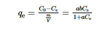 式中:qe為吸附劑相平衡濃度,mg·g-1;Ce為吸附平衡時的溶質濃度,mg·L-1;a,b為Langmuir等溫線方式常數,單位分別為L·mg-1和mg·g-1;m為吸附劑的投加質量,g;V為溶液的體積,L。