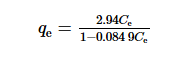 經擬合計算,以1/qe對1/Ce作圖可得到一條直線,該擬合直線的相關系數為0.993,由此可以推斷吸附過程較好地遵循Langmuir吸附等溫方程。式(2)為Langmuir吸附等溫線的表達式。