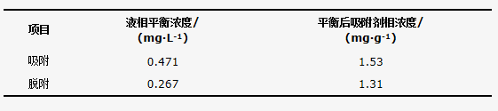 一般而言,吸附作用是可逆的。吸附平衡時,吸附質的液相濃度Ce和吸附劑相濃度qe可由式(2)計算,當平衡的吸附劑與低于Ce的溶液接觸時脫附可能發生]。由表 2可知,吸附和脫附后吸附劑相平衡濃度分別為1.53 mg·g-1和1.31 mg·g-1,所以計算得脫附率為14.3%,不可忽略。