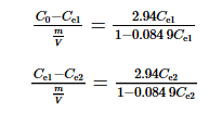 啟動階段,先向反應器投入m/V (1.00 g·L-1)的吸附劑,吸附平衡后,液相溶質濃度達到Ce1;排出反應器內的舊吸附劑后,再投入量為m/V (1.00 g·L-1)的吸附劑,吸附平衡后,液相溶質濃度達到Ce2。由式(2)可得式(3)和式(4),分別計算Ce1和Ce2。