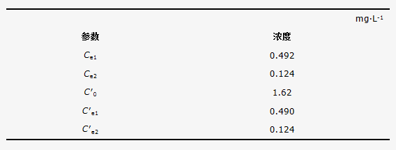 計算時公式中的吸附劑投加量m/V始終保持1.00 g·L-1,依次求解式(3)~式(6),可分別計算出Ce1、Ce2、C′e1和C′e2,結果見表 3。由表 3可知,工藝運行后理論出水濃度與啟動階段的濃度相同,C′e2為0.124 mg·L-1。