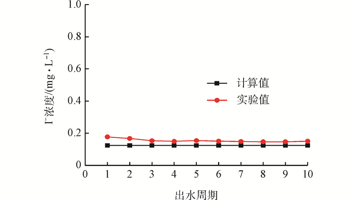 10個周期出水I-濃度實測平均值為0.150 mg·L-1,I-的去除率為92.5%;而計算值為0.124 mg·L-1,I-的計算去除率為93.8%,2個去除率差別不大。分析差別產生的原因:在攪拌過程中容器壁和攪拌槳會黏附少量吸附劑,致使實際參加吸附的吸附劑比實際投加的量要少,吸附效果受到影響。另外實驗期間由于部分舊吸附劑黏附在反應器內壁,未被完全排出而發生脫附也是產生誤差的原因。