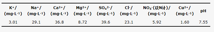 將10個循環的出水混合,測定混合出水的水質,結果如表 4所示。對比表 1和表 4可以看出,出水中NO3-(以N計)濃度較原水升高,可能是由于吸附劑制備過程中引入了Cu(NO3)2·3H2O,但仍符合中國生活飲用水衛生標準。另外,對出水中Cu2+和pH進行測定,結果如圖 7所示。出水中pH平均值為7.50,Cu2+平均濃度為1.60 mg·L-1,高于中國生活飲用水衛生標準,但是符合世界衛生組織頒布的《飲用水水質準則》,這方面有待進一步研究。