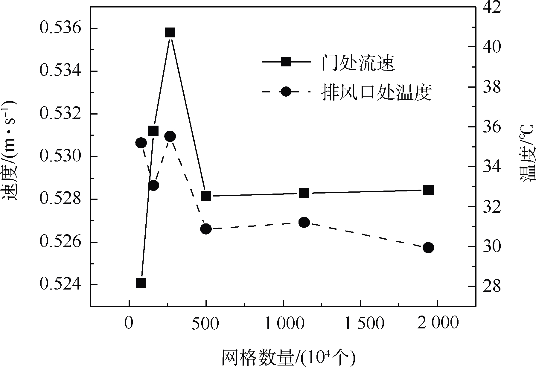 模型計算域比較簡單,采用計算精度較高的六面體網格。將網格劃分為82×104、162×104、270×104、500×104、1 140×104和1 943×104個,脫水機房門處的風速和溫度如圖2所示。結果可以看出,當網格數量達到500×104個時計算結果基本趨于穩定,故模型網格數量采用500×104個。Fluent中RNG模型在室內氣流的模擬中能夠取得較好的結果。脫水機房內氣體流動屬于室內流動,本研究采用RNG模型預測氣流組織。同時涉及到惡臭氣體的擴散,采用Species Transport模型。
