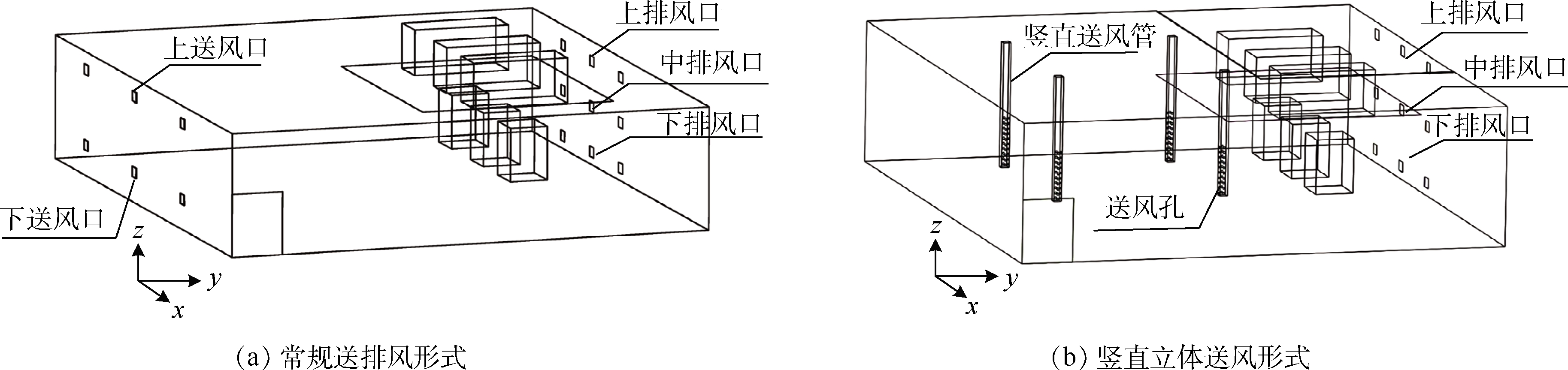 為了進一步降低惡臭濃度,改善脫水機房工作環境,探究不同氣流組織下脫水機房除臭效果,對原有脫水機房通風形式進行改造。排風有3種形式:側上排、側中排(原排風位置)和側下排,送風形式也設置成2種:側送和立體送風。其中側送風分為側上送風和側下送風,如圖5(a)所示。立體送風形式是研究過程中提出一種新型的送風形式,如圖5(b)所示。