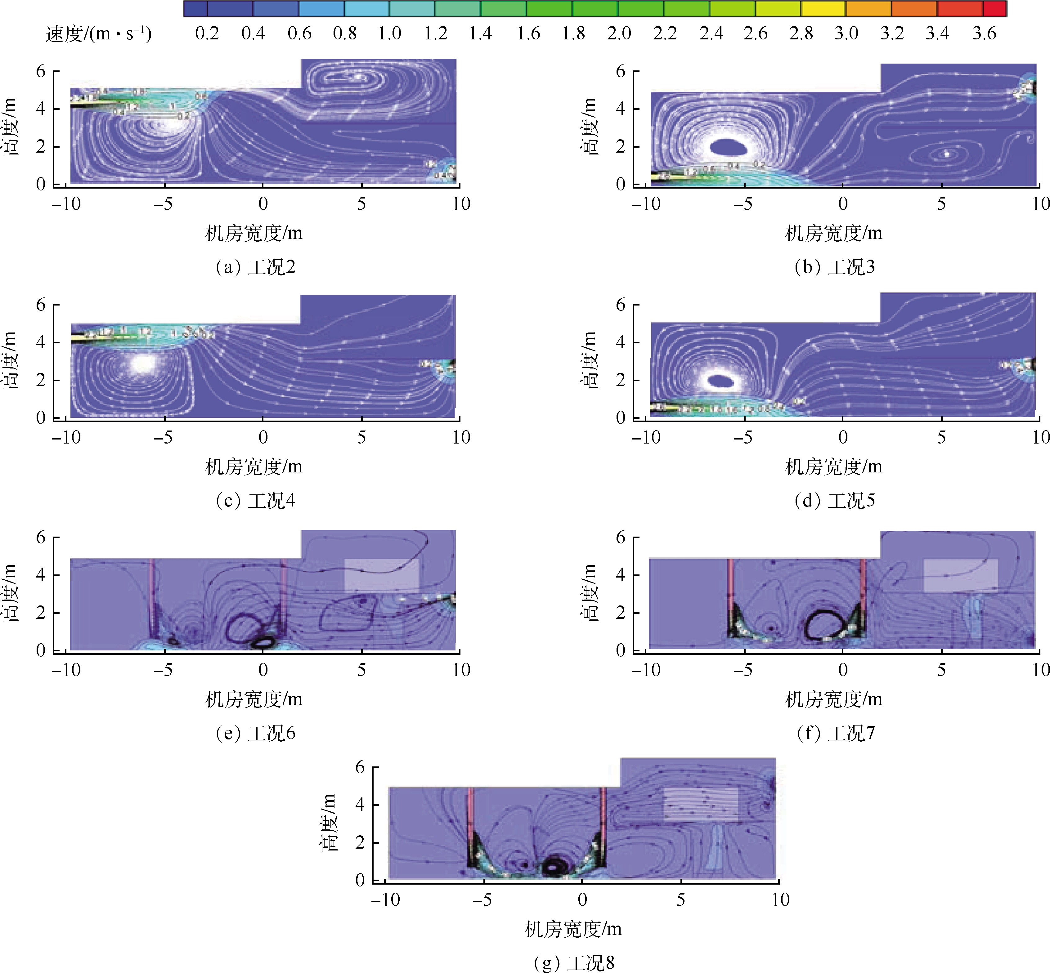 7種工況下送風口截面上氣流狀體如圖6所示?梢钥闯,相同送風量條件下,側送風(工況2~5)風口風速最大2.6 m·s-1,5 m距離后速度迅速衰減到0.2 m·s-1。從氣流流線看出,測送風新風進入機房內直接有排風口排出,這樣造成大部分氣流短路,不利于惡臭排除,造成排污效率下降。相反,工況6、7立體送風風口分布在立體管,氣流擾動較大,室內平均風速在0.4 m·s-1,新風進入機房后較少部分短路,使得機房內平均惡臭濃度較低,有效地提高了排污效率。雖然工況8采用立體送風形式,但排風口位置位于上部,料斗口逸散的惡臭排出路徑長,再加之擾動的氣流更不利于其排出,故造成該工況上排污效率較差。