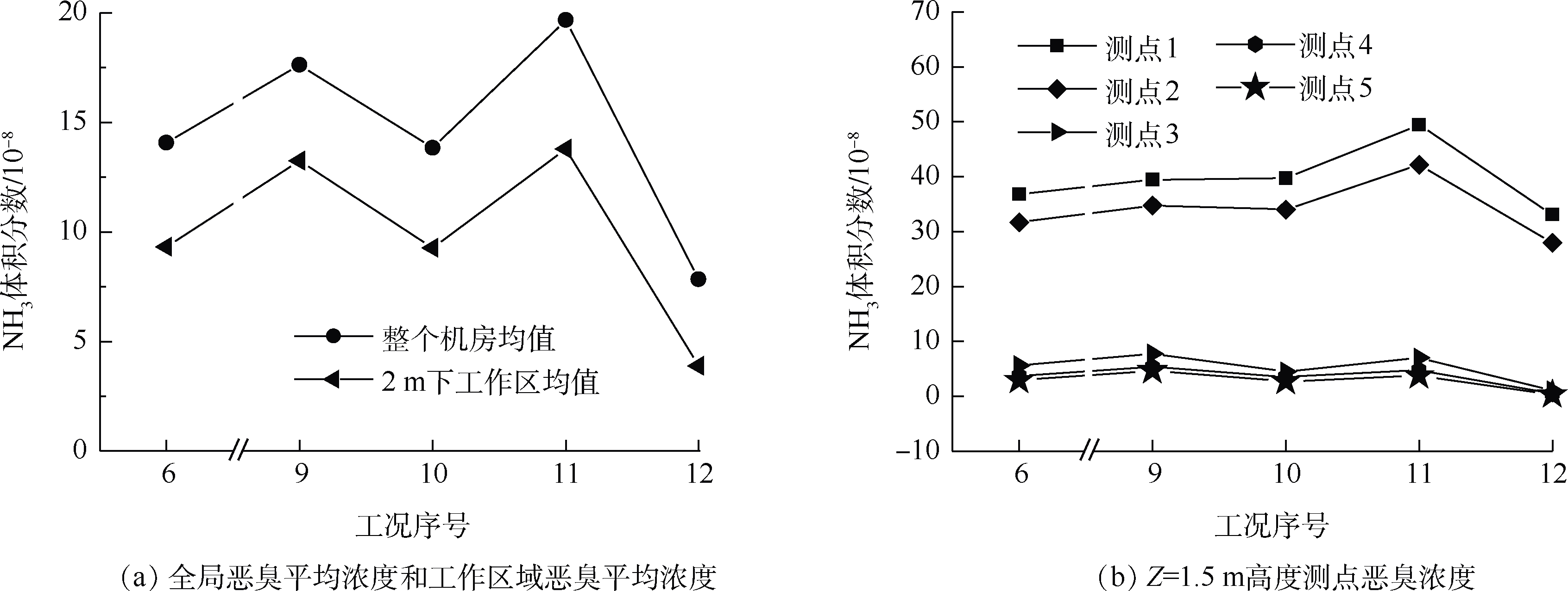 圖7是7種工況惡臭濃度模擬結果。圖7 (a)是呼吸高度(Z=1.5 m)NH3體積分數分布云圖,從圖7 (a)中可以看出,在工況6條件下,NH3平均體積分數最低,為1.16×10-7,與工況1實測數據相比降低了43.7%。立體送風將新鮮空氣直接送到機房內,對周圍環境進行稀釋,因此,立體送風工況機房NH3平均體積分數要低于側送風,更有利于改善機房內空氣品質。